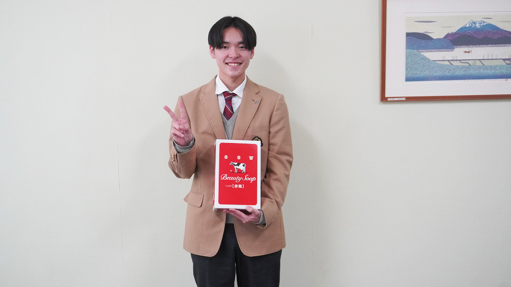 昨年9月から10月にかけて実施した「牛乳石鹸 お風呂川柳2025」(牛乳石鹸株式会社主催)において、34HR大塚琉馬君の作品が入選しました。大塚君の入選句は「風呂狭い 大きく育った 証かな」で、担当教員の太田先生は「高校生の等身大の思いと素直さが伝わってくるいい句です。」とコメントしてくれました。応募5000句の中から入選44句の一句に選ばれた大塚君は「自分の成長が読み手に伝わる句を作りました。入賞すると思わなかったので、入賞と聞いた時にはとても嬉しかったです。」と入選の感想を話してくれました。大塚君受賞おめでとうございます。このように俳句に親しむ生徒たちの活動がますます活発になることを期待します。