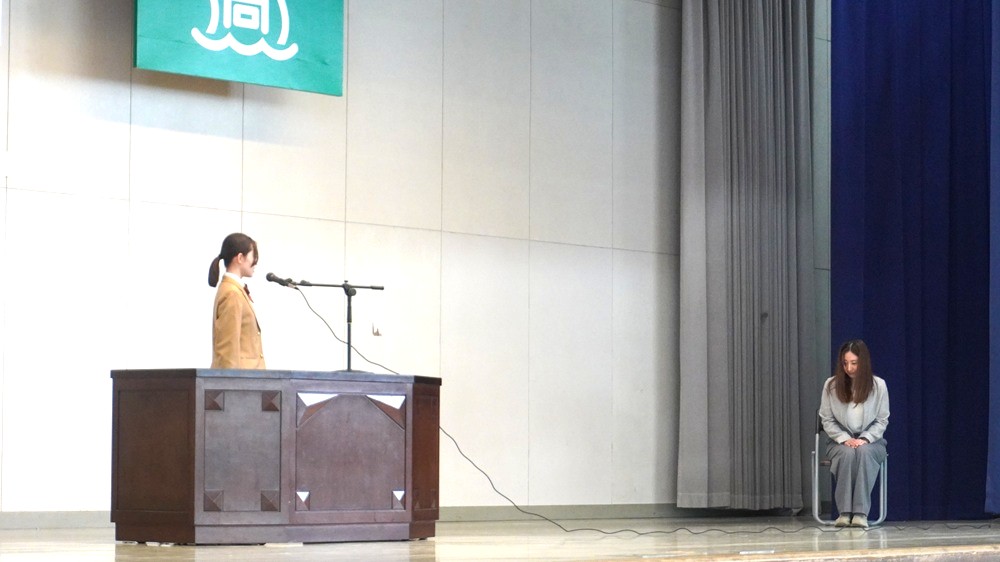 3月19日学年末終業式後に、令和7年度末の離任式を行いました。今年度末で転退職される渡邉久季先生に全校生徒、職員でお世話になった気持ちを伝えてお見送りしました。渡邉からお別れのメッセージをいただいたあと、生徒会から記念品の贈呈を行いました。渡邉先生これまで御指導ありがとうございました。心よりお礼申し上げます。