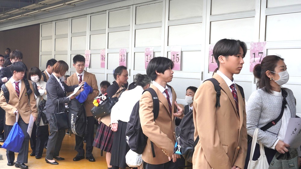 受付に向かう入学生、保護者