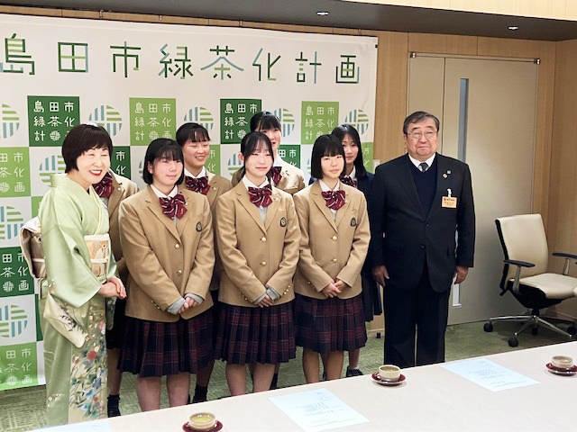1月14日(水)2つの全国大会に出場する女子卓球部が島田市役所を訪れ、染谷絹代島田市長に出場報告を行いました。今回訪問したのは全日本卓球選手権ジュニアと一般の個人2種目に出場する草間ひかるさん(24HR)、一般と混合のダブルス2種目に出場する濵本光来さん(36HR)、全国高校選抜卓球大会学校対抗に出場する草間さん、柴田雅さん(21HR)柴廉さん(27HR)玉石汐里さん(15HR)中川璃乃さん(15HR)です。女子卓球部の皆さんは、染谷絹代市長に全国大会での活躍を力強く誓いました。全日本卓球選手権は今週からいよいよ始まります。卓球部の皆さん、全国大会という大舞台でも臆することなく自分の力を発揮してくれることを期待します。