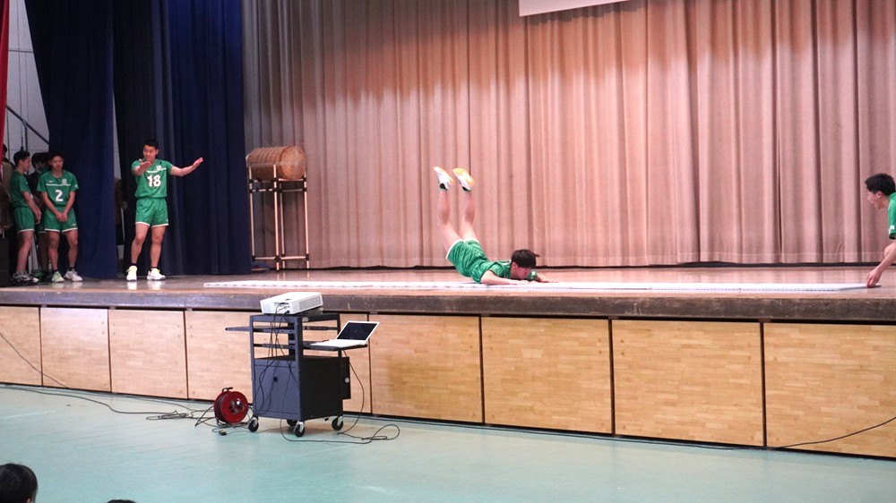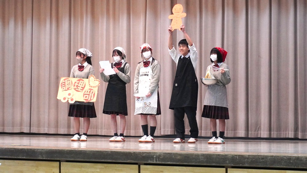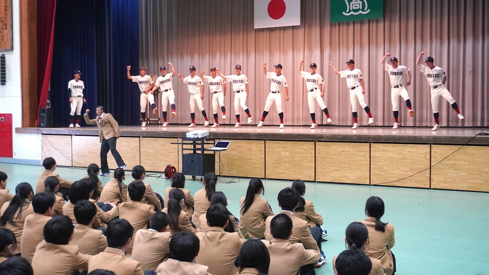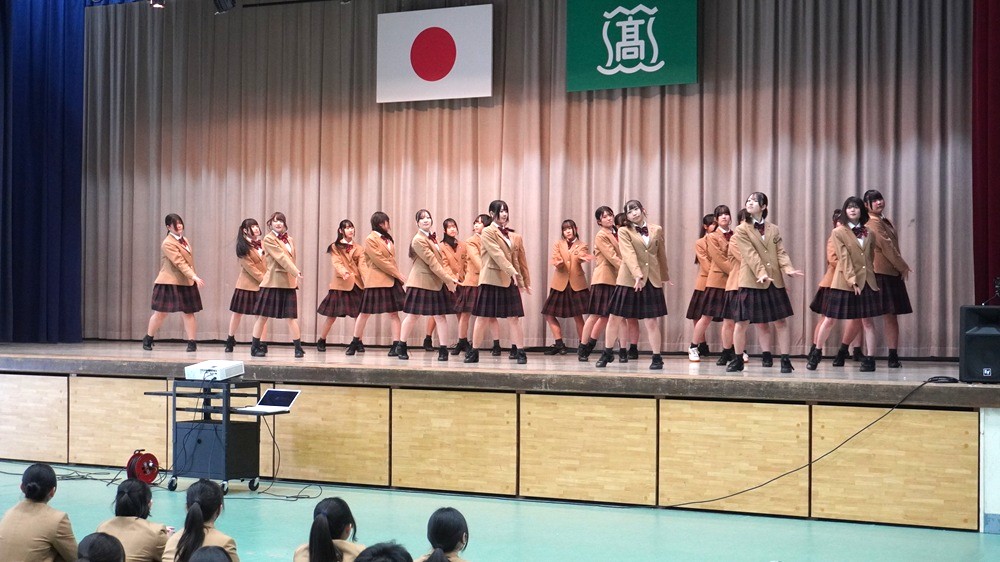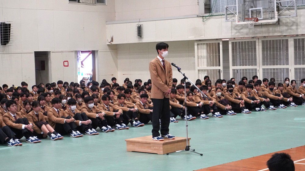 本日4月8日(水)新入生歓迎の対面式、部活動紹介が行われました。対面式では最初に応援団から歓迎のエールがあり、続いて生徒会長赤堀月那さん(35HR)から新入生を歓迎する挨拶がありました。そのあと新入生を代表して朝比奈海琉君(13HR)が高校では勉強と部活の両立に頑張りたいと抱負を語ってくれました。対面式のあとには各部活動が工夫をこらした紹介を行いました。ユニフォームをまとってステージに上がった部活もあり、新入生たちは真剣に部活説明を聞いていました。今日の会で、新入生の皆さんは、あらためて樟誠高校の生活に期待が膨らんだことと思います。