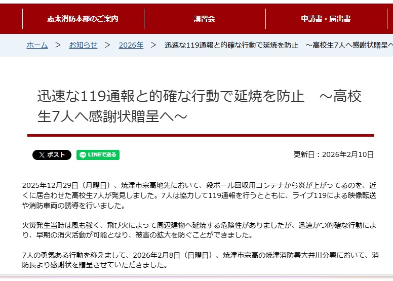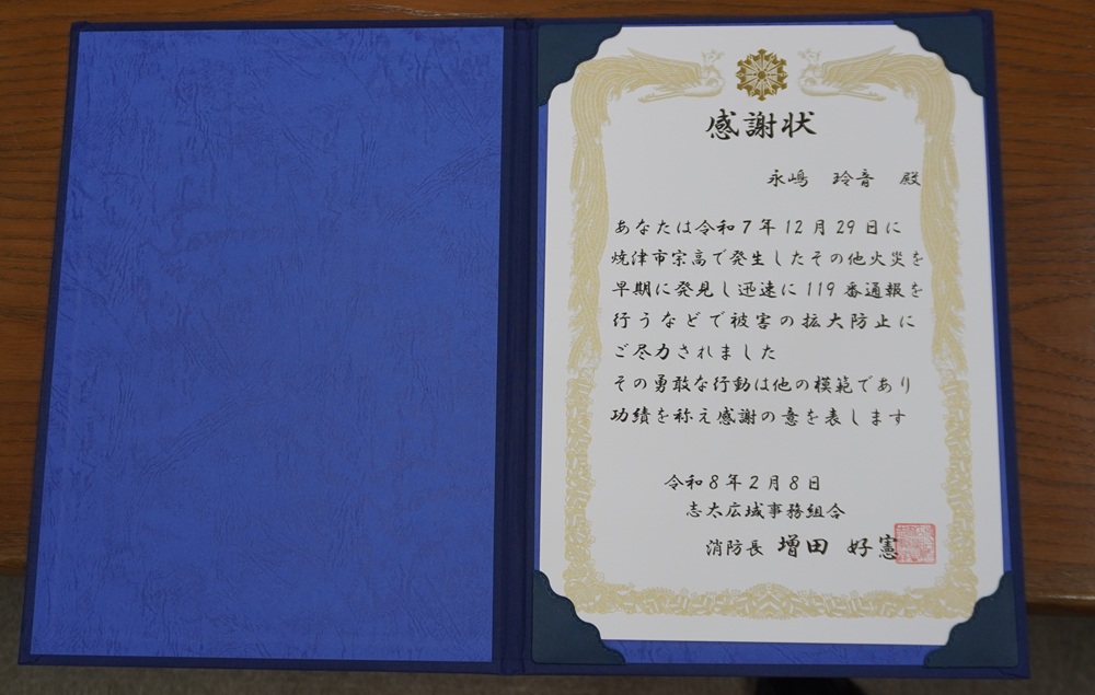永嶋玲音君(16HR、野球部)は202628日(日)焼津消防署大井川分署において勇気ある行動が称えられ感謝状を贈呈されました。永嶋君たちがとった行動は、20251229日(月)焼津市内で段ボール回収用コンテナから炎が上がっているのに仲間たちと居合わせ、すぐに119番通報を行うとともに、消防車両の誘導などもお手伝いしました。この行動によって早期の消火活動が可能となり、被害の拡大を防ぐことができたことから感謝状の贈呈につながりました。永嶋君のとった行動は、島田樟誠高校生にとって模範的な行動です。引き続き他の生徒もとっさの場面で勇気ある行動をとってくれることを期待します。