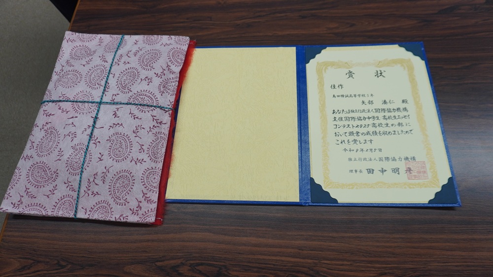矢部湊仁君(38HR)JICAエッセイコンテストで入選し本校で贈呈式行われる!