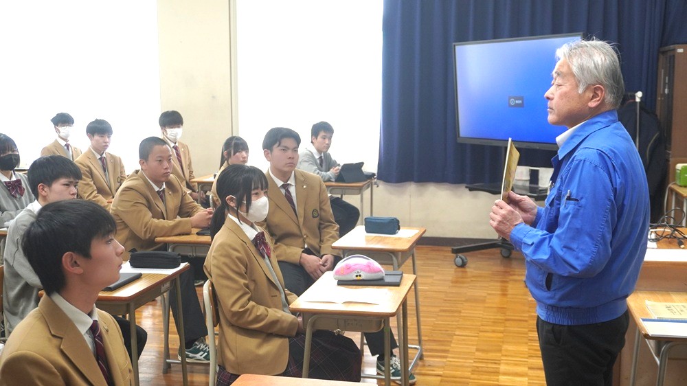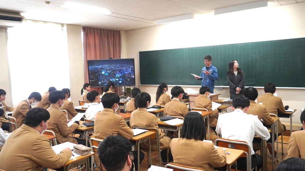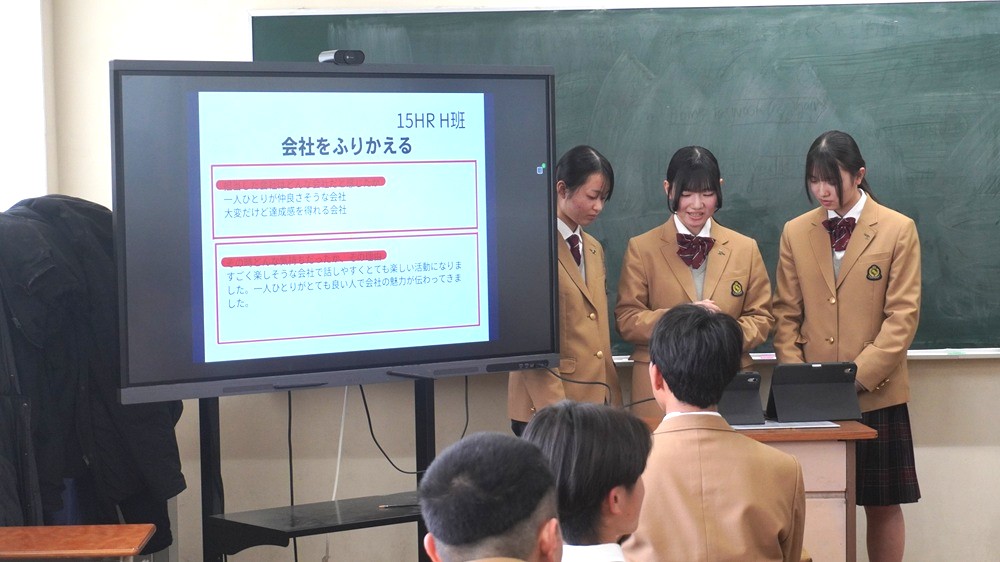 2月20日(金)1年生キャリア探究コースは夢プロ授業で「ビジネスミッション最終発表会」を行いました。この発表会は、各企業から事前に提示された課題について、生徒たちが解決方策を考えて企業の方々にプレゼンするものです。この日は1年生の各教室ごとに企業の方々が配置され、生徒たちが教室を移動しながら発表するという形式でした。今回協力してくれた企業は、豊樹脂、池田製作所、松浦スチロール、ジャパンスリーブ、探究のミカタ、関本管工の6社です。生徒たちは、自分たちの解決策を見学生徒や企業の方々に一生懸命発表しました。最後に各企業から講評をいただきましたが、皆さんいちように本校生徒の頑張りを褒めてくださいました。今回夢プロ学習に取り組んだ1年生の皆さん、お疲れ様でした。引き続き探究学習に取り組んで豊かな学びを深めてください。