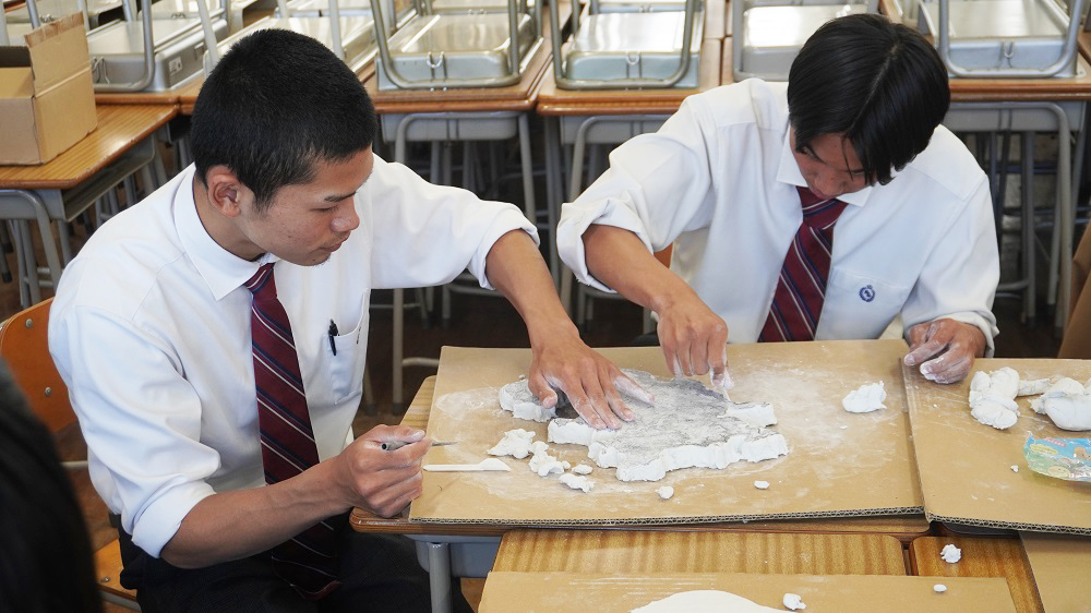 キャリア探究コースの総合選択授業は、進路や興味関心に合わせて科目選択できる、生徒たちから人気の高い授業科目です。総合選択社会科では、例年世界遺産に指定されるような有名な地形を紙粘土で作成していますが、地図や等高線を読み取る地理的な学力に加え、グループによる活動で協働性や表現力や課題解決能力の育成を意図しています。今年は小笠原諸島父島の立体模型作りにチャレンジしています。担当の酒井先生は「仲間と助け合ってひとつのものを作り上げて、生徒には成長してほしい。」とコメントしていました。立体模型作りにチャレンジしている皆さん、3学期の完成に向けて引き続き頑張ってください。