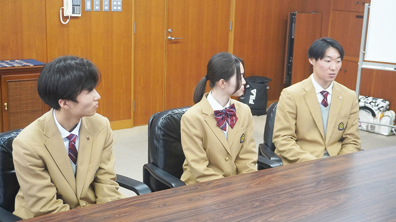 2月14日(土)午後、在校する生徒会役員4人と生徒会長OB・OG2人の合計5人で百周年記念座談会を行いました。参加してくれた卒業生は、河村玲さん(2023卒、鳥取大学在学中)滝川哲也さん(2018卒、静岡県立大学大学院在学中)の2人です。また現役生は赤堀月那現生徒会長(25HR)原川瑞輝現副会長(27HR)三嶽絆斗前生徒会長(36HR)が参加しました。5人は、百年間連綿と続く歴史を意識しつつ、島田樟誠高校のこれまでとこれからを熱く語り合いました。この座談会の様子は、あらためて百周年記念誌に掲載いたしますので、ぜひそのトピック記事を楽しみにしていてください。
